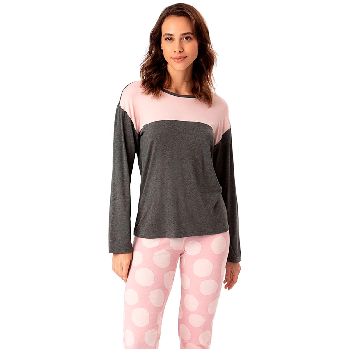 Poá, um clássico que amamos. Pijama Lua Cheia malha leve, de Viscose com Elastano toque macio. Ideal para quem não abre mão do conforto. O pijama feminino longo é a escolha perfeita para manter o corpo aquecido e desfrutar de momentos de relaxamento com estilo. ele também é uma opção confortável para ficar em casa, relaxar no sofá e aproveitar os momentos de lazer durante o inverno. Camiseta em tom Cinza e Rosa um Charme. Calça Rosa com Poá num tom Rosa mais Claro Composição 96% Viscose/ 4% Elastano. Lua Cheia: 9959 Atenção: Foto ilustrativa. Os acessórios e calçado não acompanha este produto.